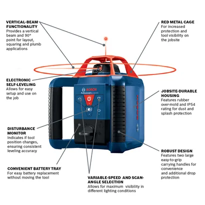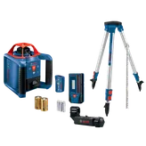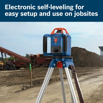 The Bosch GRL1000-20HVK Self-Leveling Rotary Laser Kit delivers a comprehensive solution for precise outdoor and indoor leveling. It features a horizontal/vertical self-leveling laser, suitable for leveling, aligning and squaring applications. The rotary laser provides users with variable speed selection and manual scan angles for maximum visibility at different lighting conditions. It delivers accuracy of up to ±1/8 In. at 100 Ft, and a range of up to 1,000 Ft. with LR10 laser receiver. The electronic self-leveling system has a disturbance monitor, which indicates to the user if tool position changes, ensuring consistent leveling accuracy on the jobsite. The laser has a metal cage and an IP54 rating. Easy to use, the kit includes a remote control that allows for one-person operation to handle leveling and grading tasks on the jobsite. This all-in-one solution includes a laser receiver, remote control, aluminum tripod, sturdy grade rod and hard carrying case.