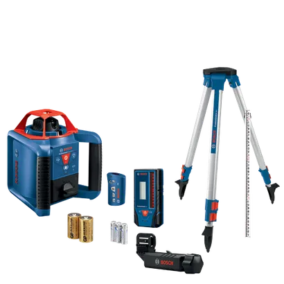 - Comprehensive rotary laser kit – features a rotary laser, laser receiver, remote control, tripod, grade rod and hard carrying case