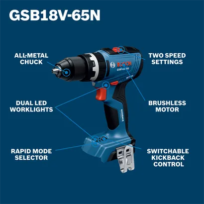Bosch GSB18V-65N drill with all-metal chuck, dual LED worklights, rapid mode selector, two speed settings, brushless motor, and switchable kickback control.