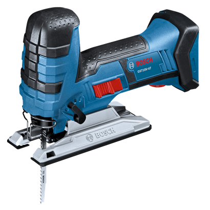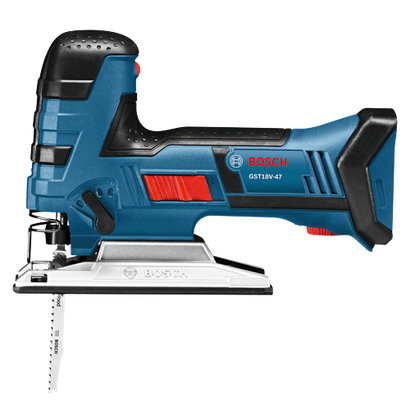This 18V jig saw delivers powerful and manageable cordless cutting, with its ergonomic, well-balanced barrel-grip design. The GST18V-47 18V Barrel-Grip Jig Saw has extended upfront soft-grip areas and a small barrel-grip circumference for greater tool control. It provides a variable-speed dial – from 550 up to 2,700 no-load strokes per minute – to match the speed to material. The jig saw has a stroke length of about 1 In., delivering a cutting capability up to 4.7 In. in wood and up to 0.8 In. in aluminum. It has four orbital-action settings for cut control and auto-stop to stop the stroke mechanism. The saw also has a large die-cast aluminum footplate with no-mar plastic overshoe to help prevent damage to the workpiece. The cut lines stay visible due to the dust blower and LED light. It features a tool-free T-shank blade-change system.