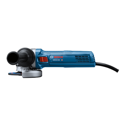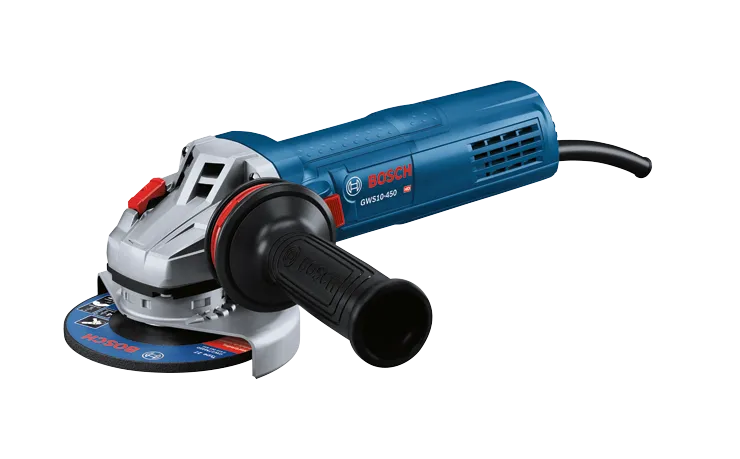 This 4-1/2 In. ergonomic angle grinder features a narrow grip zone for all-day comfort and control, combined with a powerful 10-amp motor. The Bosch GWS10-450 angle grinder delivers results, producing up to 11,000 no-load rpm for maximum productivity in grinding and cutting applications. The tool weighs 4.5 Lbs. Equipped with epoxy-coated field windings, double-sealed bearings and direct-motor cooling, this grinder is built for a longer tool life. It features spiral bevel gears for smooth transmission of power. For added convenience, it has an anti-vibration side handle, a lock-on slide switch and an adjustable tool-free guard with multiple fixed-adjustment settings to allow the user to position the guard in a variety of working angles. It has an updated gearhead mounting collar, which is now compatible with all Bosch metal and concrete guards.