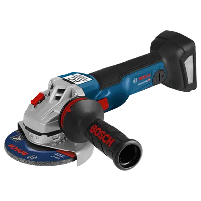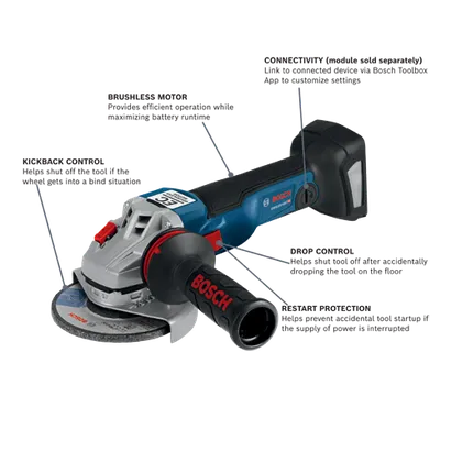 The Bosch GWS18 V-45CN 18 V EC Brushless Connected-Ready 4-1/2 In. Angle Grinder combines legendary Bosch grinder performance with connected-ready capability. The GWS18 V-45C’s efficient EC Brushless motor delivers greater runtime, and it has the capacity to transfer up to 35% more power and up to 110% more runtime with an optional CORE18 V battery (sold separately). Add advanced operational electronics, and the tool provides the best cordless grinding and metal-cutting experience available. When coupled with an optional Bosch GCY30-4 Bluetooth® connectivity module, the connected-ready grinder supplies next-gen user control, using the free Bosch Toolbox app on a mobile phone. It has advanced electronics for enhanced user protection, such as KickBack Control to reduce the hazard of sudden tool reactions to binding situations, drop control to shut the grinder off after accidentally dropping the tool on the floor, restart protection to help prevent accidental start-up and soft-start technology to ease into cuts. It also features a burst-resistant wheel guard. This tool features a two-position Vibration Control side handle, ergonomic slim soft-grip design and a large spindle lock. It is a bare tool; the battery and charger are sold separately.
