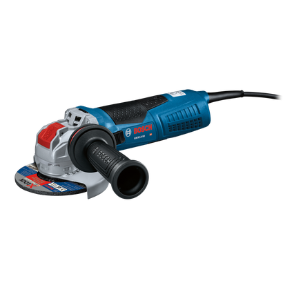 The Bosch GWX13-50 5 In. X-LOCK angle grinder features the X-LOCK mount, offering a wheel change that's up to five times faster than conventional interfaces. There’s an audible snap when mounting an X-LOCK wheel on an X-LOCK grinder. The wheel mounts properly without the need for a spanner wrench or flange nuts. The wheel is released from the grinder with the pull of a lever. The angle grinder delivers maximum power – 13 amps and 11,500 rpm. Equipped with epoxy-coated field windings and direct-motor cooling, this grinder is built for a longer tool life. It features spiral bevel gears for smooth transmission of power. It has a Vibration Control auxiliary handle for additional user comfort and an adjustable tool-free guard.