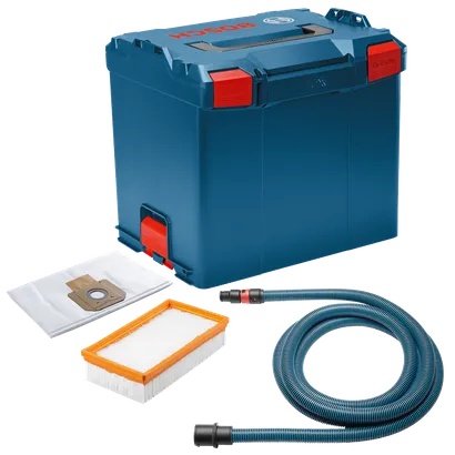 The Bosch GXA4-01L PRO+GUARD™ Surfacing Kit features a HEPA filter, fleece filter bag and other accessories to upgrade the VAC090-series dust extractor. The VF130H HEPA Filter captures 99.97% of particles 0.3 microns and larger, and it has a low-stick surface to enhance the filter-cleaning process. It helps users move toward compliance with the OSHA respirable crystalline silica dust regulation. The VB090F Fleece Filter Bag acts as a preliminary filter, and the port cover securely closes to keep the dust inside during disposal. The filter and fleece bag are for use in dry applications only. The VH1635A 16 Ft., 35mm Anti-Static Dust Extractor Hose is engineered specifically for Bosch VAC series dust extractors. This crush-resistant hose helps prevent static shock, and it features a locking ring that securely connects to many Bosch power tools and dust-extraction attachments. The L-Boxx-4 tool carrying case (part of the L-Boxx tool-storage system) is also included. The case integrates with the dust extractor for a mobile workstation.