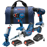 The Bosch GXL18V-496B22 18V Cordless Four-Tool Kit is a convenient way to get into the Bosch's 18V platform. Included is the GDX18V-1800 two-in-one cordless impact driver/wrench for use with bits and sockets. It does two jobs with one tool and goes from impact wrench to impact driver fast. The DDS181A Drill/Driver features a compact motor with the same power as conventional 18V motors at a lighter weight. It produces 600 In.-Lbs. max torque. The GSA18V-083 Reciprocating Saw is 15-3/4 In. long and only 4.4 Lbs. (tool only), but it delivers 0-3,050 strokes per minute. The GLI18V-300 is a bright light with 300 minutes of runtime per amp hour. The kit comes with two 18V 2.0 Ah SlimPack batteries and a charger.