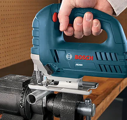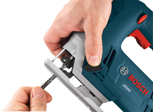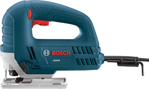 The Bosch JS260 Top-Handle Jig Saw provides a sturdy footplate for accuracy in the cut, as well as a 6.0 Amp motor and variable-speed control. The sturdy motor produces up to 3,100 strokes per minute, with a 3/4 In. stroke length. The variable-speed dial controls the maximum speed, while the accelerator trigger regulates the operating speed. This jig saw is engineered with a low-vibration plunging design for cutting accuracy and smooth operation. It has a large heavy-gauge steel footplate. The JS260's multidirectional blade clamp delivers the superior grip of T-shank blades (but it does not accept U-shank blades). The toolless T-shank blade-change system makes blade insertion and removal quick. The tool has an always-on dust blower for max cut-line visibility and an ambidextrous lock-on button.