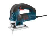 The Bosch JS470E Top-Handle Jig Saw provides unsurpassed cut precision. Finish carpenters and kitchen and bath installers will appreciate the best-in-class 7.0 Amp motor and variable-speed control, making this saw an excellent choice for curve-cutting. A dial on the back of the tool controls the maximum speed and the accelerator trigger controls the operating speed. Built with an aluminum gearbox and an insulated cover, this jig saw comes with a low-vibration plunging design and Constant Response circuitry for consistent speed under load. It has a large die-cast aluminum footplate. The JS470E's multidirectional blade clamp delivers superior grip of T-shank blades (but it does not accept U-shank blades). The blade-ejection lever that eliminates need to touch hot blades. It has a dust blower for max cut-line visibility.