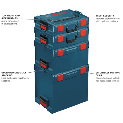 The Bosch L-Boxx stackable tool-storage system features cases that interlock on the top and bottom with other L-Boxx products to keep from slipping. Each case is designed so users can gain easy access even when the boxes are stacked. There are handles on the sides, front and top of this case, so the user can carry in whatever manner is most comfortable. The front handle is larger for easier gripping. The clips on the case are easy to lock down to keep the items inside from falling out. They also are simple to open quickly. The cases can lock with optional padlocks to avoid stolen tools. The Bosch Click & Go® system allows user to efficiently organize, store and transport their tools and accessories. The Bosch L-BOXX-4 Storage Case is designed to store many of Bosch’s larger tools, including planers, routers, some sanders, cordless circular saws, reciprocating saws and other tall or vertically oriented tools.