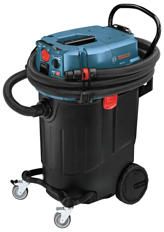 The Bosch VAC140AH 14-Gallon Dust Extractor with Auto Filter Clean and HEPA Filter provides a complete package that is designed to help users move toward compliance with the OSHA silica dust regulation. The dust extractor delivers a maximum 150-cubic-feet-of-air-per-minute rate (CFM), with a sustainable 97 In. static water lift (maximum). The automatic on-board filter-cleaning system activates every 15 seconds to help maintain maximum suction power. The included HEPA filter captures 99.97% of particles at 0.3 microns and larger. The included fleece filter bag helps to protect the filter and provides the optimal containment of dry dust and debris. The dust extractor also has power tool activation that allows the tool to activate the vac and a Power Broker dial to match the suction force to application.