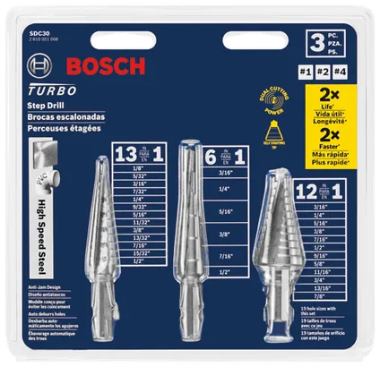 - Diseño de brocas escalonadas para herramientas inalámbricas: diseñadas para un taladrado óptimo con taladros inalámbricos a velocidades altas y bajas, con 2 bordes de corte y escalones con ángulos optimizados