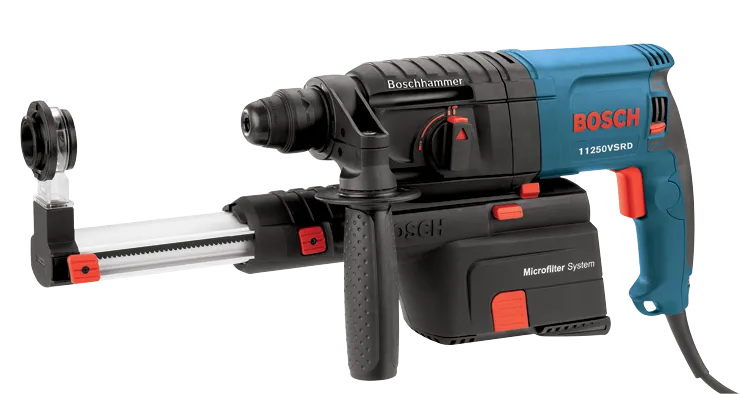 El rotomartillo SDS-plus® Bulldog™ 11250VSRD de 7/8" de Bosch con recolección de polvo cuenta con un sistema de ventilación doble que incluye un segundo juego de aspas con el que se consigue una excelente succión de aire y, por tanto, mayor recolección de polvo. El sistema de microfiltro cuenta con un filtro de papel que capta un volumen elevado de polvo de sílice, reduciendo así la exposición del usuario a este mineral. El martillo en sí pesa tan solo 5.5 lb, pero cuenta con un fornido motor de 6.1 A que aporta 1.7 ft-lb de energía de impacto. Cuenta con mango ergonómico de agarre tipo pistola que aporta confort y rendimiento excelentes en trabajo continuado o en lugares de difícil acceso. Cuenta con selector de modo dual para un taladrado versátil: modo rotomartillo o solo rotación. El 11250VSRD dispone de una placa de escobilla giratoria que prolonga la vida de la escobilla y de un gatillo reversible de velocidad variable para un arranque exacto de la broca. El sistema SDS-plus® permite cambiar de broca sin herramientas y bloquea automáticamente la broca. Tiene un embrague integral que minimiza el riesgo de reacción de torque.