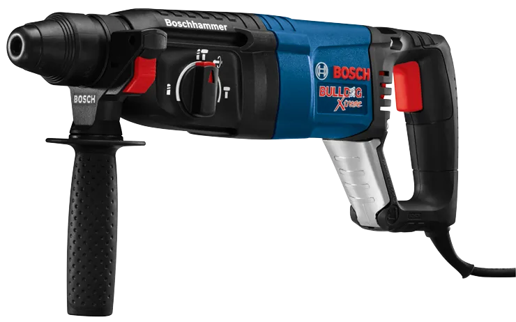 El rotomartillo SDS-plus® Bulldog™ Xtreme 11255VSR de 1" de Bosch es una herramienta útil y versátil con un motor resistente de 8.0 A. Desde los anclajes hasta la rotura de materiales grandes, realiza las tareas perfectamente a la primera. Con un diseño que sigue la tradición de los legendarios Bulldogs, este potente martillo ofrece una energía de impacto de 2.0 ft-lb y de 0 a 5,800 BPM sin carga, aunque solo pesa 6.7 lb. El selector de modo multifunción permite al usuario seleccionar fácilmente el modo de funcionamiento entre los tres disponibles: rotomartillo, solo rotación y solo martillo. Para optimizar el ángulo de cincelado, cuenta con posicionamiento Vario-Lock, que gira y fija el cincel en 36 posiciones diferentes. Se trata del sistema antipolvo PRO+GUARD™ de Bosch, el cual ayuda a los usuarios a cumplir con la regulación relativa al polvo de sílice de la OSHA, según lo indicado en su tabla 1. El martillo se ha diseñado con un mango en D ergonómico para ofrecer más comodidad. Cuenta con un gatillo reversible de velocidad variable para un arranque preciso de la broca, así como con una placa de escobilla giratoria exclusiva de Bosch que ofrece igual potencia en posición reversa y hacia delante. A los profesionales ocupados les resultará muy útil el HammerHook de la herramienta, que les permitirá colgar la herramienta durante el trabajo, así como el sistema SDS-plus® para cambiar la broca sin herramienta.