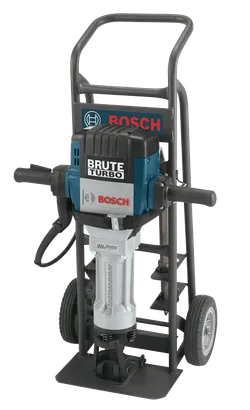 El martillo demoledor Brute Turbo BH2770VCD de Bosch brinda la mejor tasa de extracción de concreto de su clase, impresionante en una herramienta de tan solo 63 lb de peso. Con 1.000 BPM y 43 ft-lb de energía de impacto, esta herramienta es apta para trabajos pesados, como remoción de asfalto en exteriores o de cimentación en interiores. El martillo demoledor con carretilla de lujo incluida es totalmente móvil y no necesita compresor; opera con CA/CC de 115/120 V, tomacorrientes de 15 A o generador portátil de 2.500 vatios. El sistema Active Vibration Control incluye un amortiguador más largo en el mecanismo de martillado, con lo que se reducen considerablemente los niveles de vibración en el origen. Los mangos montados con amortiguación completan el sistema de control de vibración al brindar a contratistas los niveles de vibración más bajos disponibles en el mercado sin necesidad de añadir tamaño ni peso adicional a la herramienta.