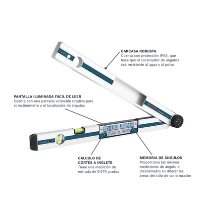 - Cinco herramientas en una: localizador de ángulo digital, inclinómetro, calculadora de ingleteadora, transportador y nivel