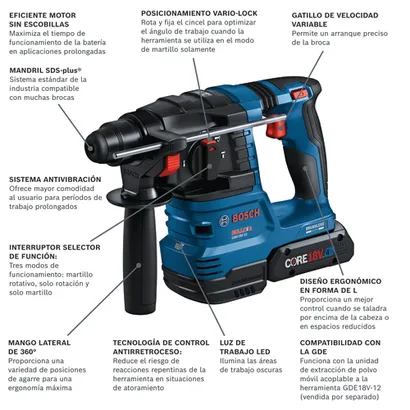 - Funciona con las soluciones de polvo Bosch PRO+GUARD™: un sistema de recolección de polvo de extremo a extremo que ayuda a los usuarios a cumplir con la normativa del polvo de sílice OSHA, y es compatible con la unidad móvil de extracción de polvo en herramienta GDE18V-12 (se vende por separado)