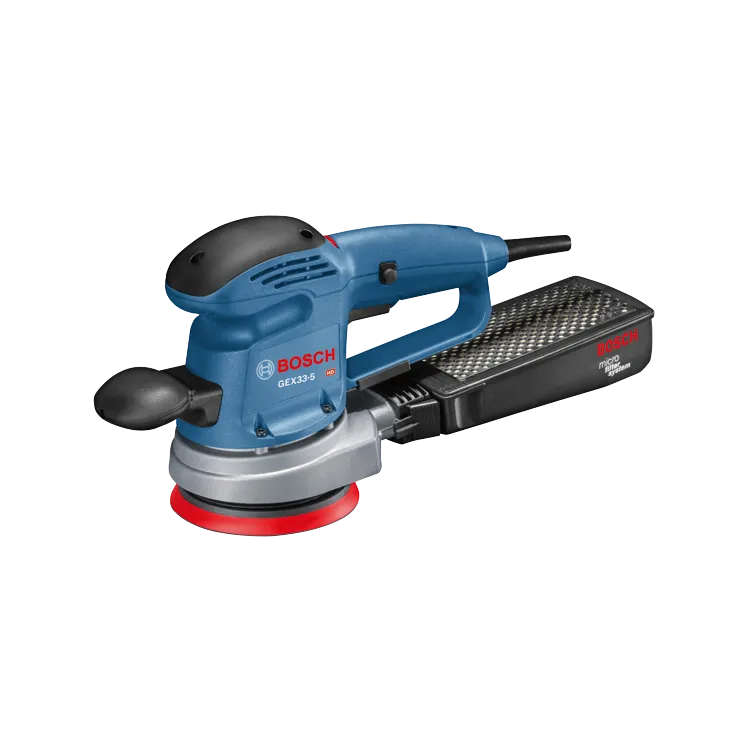 La lijadora/pulidora aleatoria orbital de varias perforaciones GEX33-5 de 5" de Bosch le permite utilizar prácticamente cualquier marca de papel de lija del mercado gracias a su diseño con varias perforaciones. La lijadora sigue manteniendo una extracción de polvo óptima para ayudar a garantizar una mejor calidad de la superficie de la pieza acabada. También proporciona una vida útil del papel de lija 2 veces mayor debido a la mayor eficiencia. Su sistema de polvo de microfiltro filtra polvo fino de hasta 1/2 micrón de diámetro. La herramienta cuenta con una caja de protección de engranajes de aluminio fundido sólido con soporte exclusivo de almohadilla de doble cojinete para reducir la vibración. El dial de velocidad variable permite al usuario ajustar la velocidad de la lijadora de acuerdo con la pieza de trabajo y la tarea, desde 4,500 hasta 12,000 órbitas por minuto (opm). Para garantizar una fijación segura del disco durante el uso, utiliza un sistema de acoplamiento de disco con fijación por contacto. La lijadora ha sido diseñada con cuerpo y parte superior de agarre flexible y ergonómico.