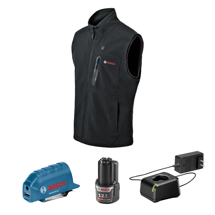 El kit de chaleco térmico GHV12V-20 de Bosch presenta un diseño versátil y moderno, materiales ligeros y flexibles, bolsillos grandes y elementos calefactores estratégicamente ubicados. El chaleco presenta tres zonas de calor combinadas con un recubrimiento exterior robusto resistente al viento y a la lluvia para ofrecer comodidad y durabilidad. Las tres zonas de calor incluyen dos zonas en el pecho y una en la espalda baja, estratégicamente situadas para un calentamiento completo y eficiente. El kit incluye el adaptador de corriente eléctrica portátil GAA12V-21 de 12 V, que permite a los usuarios utilizar una batería de 12 V máx. de Bosch para producir 2.1 A. Este adaptador también puede suministrar energía a los dispositivos personales más comunes, por ejemplo, dispositivos móviles, teléfonos celulares y tabletas, entre otros. Los usuarios que buscan aún más tiempo de funcionamiento y la posibilidad de utilizar sus baterías de 18 V de Bosch pueden optar por un adaptador de corriente eléctrica portátil GAA18V-24 de 18 V compatible, a la venta por separado.