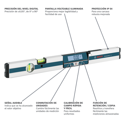 El nivel digital de 24 in GIM 60 de Bosch proporciona una pantalla en ángulo iluminada para una mejor legibilidad, convirtiéndolo en un nivel digital ideal para tareas en áreas difíciles u oscuras. La pantalla de fácil uso gira automáticamente. Con un tono indicador audible para nivelación o 90°, este inclinómetro tiene un botón de retención/copiar y memoria para transferir valores de destino a otras zonas en el sitio de trabajo. Tiene una precisión sobresaliente, con una precisión de nivel de 0 ° o 90 ° de ± 0.05°. Los usuarios obtienen mediciones precisas en grados, por ciento o pies y pulgadas para facilitar la adaptabilidad. La herramienta cuenta con una carcasa robusta con protección IP 54, para protegerlo del polvo que se encuentra en los sitios de trabajo.