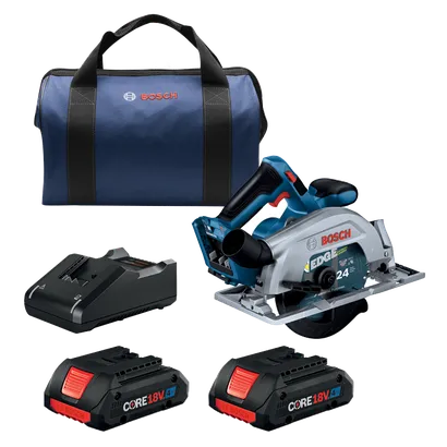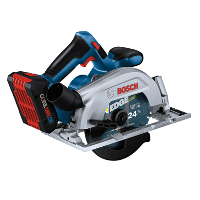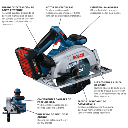 Esta sierra circular posee una capacidad de corte de 2-1/4", lo que le permite cortar materiales de 2X (dos por) en cualquier grado de alcance de bisel. La sierra circular con hoja a la derecha GKS18V-22 de 6-1/2" y 18 V de Bosch presenta un motor Brushless sin escobillas que proporciona un tiempo de funcionamiento eficiente y 5,000 RPM con confiabilidad profesional. Esta sierra compacta pesa únicamente 6.1 lb (solo herramienta, sin incluir batería). El mango auxiliar mejora la estabilidad y el manejo de la herramienta, tanto con la mano izquierda como la derecha. Los cómodos calibradores de profundidad de la sierra son visibles desde cualquier lado de la misma y cuenta con un rango de bisel de 0-50 grados, con topes a 0, 45 y 22.5 grados. Cuenta con dos prácticos medidores de profundidad: uno en la protección inferior y otro en la carcasa para que la profundidad sea visible a cada lado de la sierra. Tiene un cómodo freno electrónico que ayuda a disminuir el tiempo de inactividad entre cortes. El puerto pivotante de 360° aleja el polvo del cuerpo cuando se sujeta la sierra con cualquier mano. La sierra también incorpora un LED de línea de corte que ilumina el área de corte de la pieza de trabajo, mejorando así la visibilidad de la línea de corte. Incluye una llave integrada para cambio de hoja y un bloqueo de eje para facilitar el cambio de las hojas. El kit incluye dos baterías Advanced Power CORE18V® de 4 Ah, cada una de ellas ofrece un tiempo de ejecución dos veces superior en comparación con la batería BAT612 de 2 Ah de la generación anterior.
