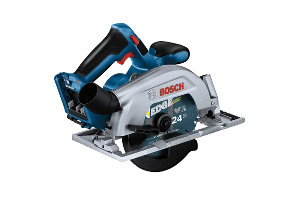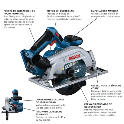Esta sierra circular posee una capacidad de corte de 2-1/4", lo que le permite cortar materiales de 2X (dos por) en cualquier grado de alcance de bisel. La sierra circular con hoja a la derecha GKS18V-22 de 6-1/2" y 18 V de Bosch presenta un motor Brushless sin escobillas que proporciona un tiempo de funcionamiento eficiente y 5,000 RPM con confiabilidad profesional. Esta sierra compacta pesa únicamente 6.1 lb (solo herramienta, sin incluir batería). El mango auxiliar mejora la estabilidad y el manejo de la herramienta, tanto con la mano izquierda como la derecha. Los cómodos calibradores de profundidad de la sierra son visibles desde cualquier lado de la misma y cuenta con un rango de bisel de 0-50 grados, con topes a 0, 45 y 22.5 grados. Cuenta con dos prácticos medidores de profundidad: uno en la protección inferior y otro en la carcasa para que la profundidad sea visible a cada lado de la sierra. Tiene un cómodo freno electrónico que ayuda a disminuir el tiempo de inactividad entre cortes. El puerto pivotante de 360° aleja el polvo del cuerpo cuando se sujeta la sierra con cualquier mano. La sierra también incorpora un LED de línea de corte que ilumina el área de corte de la pieza de trabajo, mejorando así la visibilidad de la línea de corte. Incluye una llave integrada para cambio de hoja y un bloqueo de eje para facilitar el cambio de las hojas.