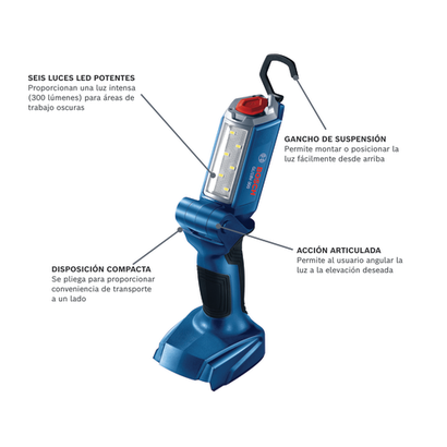 La luz de trabajo LED articulada GLI18V-300N de 18 V de Bosch es una luz inalámbrica compacta, ligera y brillante. Ofrece 10 horas de iluminación con una batería SlimPack de 2.0 Ah (no incluida), la cual brinda, por ejemplo, 300 minutos de funcionamiento por cada amperio-hora (Ah) proporcionado por la batería de 18 V de Bosch. Esta luz de trabajo flexible puede iluminar una amplia zona de trabajo y mantenerla iluminada por horas. Sus 300 lúmenes son brillantes y pueden iluminar hasta esquinas oscuras en la zona de trabajo. Pesa menos de 11 oz (solo herramienta, batería no incluida). La luz se pliega fácilmente para facilitar su posicionamiento y su desplazamiento y, además, cuenta con un gancho que permite colgarla y seis luces LED para brindar una iluminación de 300 lúmenes. Se trata de una herramienta básica. La batería y el cargador se venden por separado.