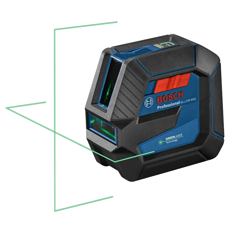 El láser autonivelador de líneas cruzadas con haz verde GLL100-40G de Bosch utiliza la tecnología de haz verde, con la que se generan líneas verdes hasta 4 veces más brillantes en comparación con los haces rojos estándares. De este modo, el alcance del láser es de hasta 100 ft. El láser produce modos de líneas verticales, horizontales y cruzadas y la herramienta puede proyectar dos líneas de forma independiente o juntas para una amplia gama de aplicaciones de alineación y nivelación. Cuenta con la tecnología VisiMax™, exclusiva de Bosch, que supervisa la temperatura de la herramienta y el consumo eléctrico para proporcionar la línea más brillante para el trabajo. La herramienta tiene una carcasa de protección de goma diseñada para que cumpla una función similar a las jaulas de seguridad, por lo que todos los puntos de impacto principales están reforzados con goma. La carcasa es de categoría IP64 y cuenta con cristales cóncavos que protegen las lentes láser. La interfaz de usuario integrada permite seleccionar fácilmente los modos. El sistema de péndulo inteligente de Bosch autonivela e indica cuándo está desnivelado y bloquea el péndulo para transportarlo con seguridad. El soporte en L LB10 y el clip para rejilla de techo DK10 permiten una instalación rápida y están equipados con potentes imanes.