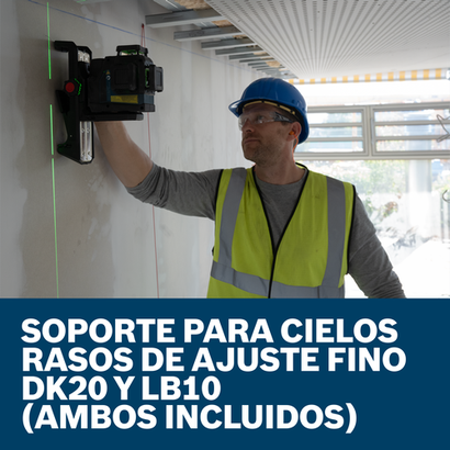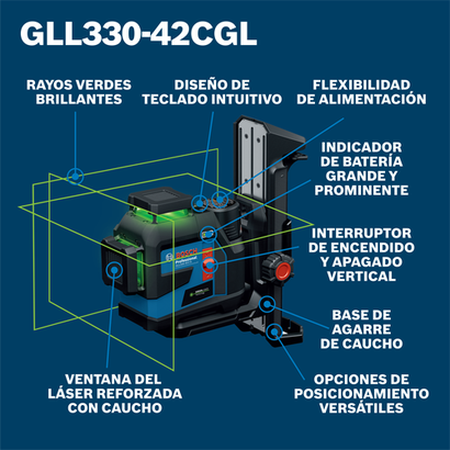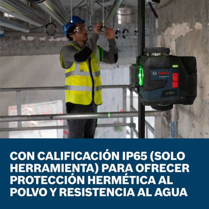 El láser de alineación/nivelación GLL330-42CGL de 3 planos de haz verde de 360º y 12V máx. de Bosch proporciona una solución de nivelación y alineación todo en uno con una increíble flexibilidad de alimentación de energía. Las opciones de alimentación de energía versátiles ayudan a maximizar la productividad y mantener el láser en funcionamiento, con uso de la batería recargable 12V máx. incluida o pilas AA (se venden por separado). La tecnología VisiMax™ incorporada optimiza la visibilidad de la línea durante el trabajo para mejorar aún más la precisión y la duración de la batería. El láser de nivelación emite 3 líneas de gis de haz verde brillante en planos láser de 360°, 1 horizontal y 2 verticales, para alta visibilidad y una configuración rápida y simplificada del trabajo desde un punto inicial. La carcasa de goma completa ayuda a proteger el nivel en los puntos de impacto principales. Clasificado con IP65 (solo la herramienta), el láser puede soportar condiciones difíciles y lluviosas y es a prueba de polvo para una protección mejorada. El láser tiene un rango de trabajo de hasta 100 ft, y las líneas brillantes y delgadas proporcionan una precisión de 1/8" a 30 ft. Es posible extender aún más el rango a 330 ft (medido en la línea horizontal a 135º y 315º) con compatibilidad con el receptor del nivel (se vende por separado). Equipada con un sistema de péndulo inteligente, se autonivela e indica si hay una condición de desnivel, y se bloquea al apagarse para un transporte seguro. Mantenga el control del láser con la base de goma y posiciónelo fácilmente con soportes roscados de ¼" y 5/8". Completamente equipado con conectividad Bluetooth®, controle la configuración del láser desde lejos y habilite el modo de ahorro de energía con opciones de ajuste de brillo para ayudar a maximizar el tiempo de funcionamiento y la vida útil de la batería, para ello es necesario emparejar el láser con un smartphone y la aplicación gratuita Bosch Leveling Remote.
