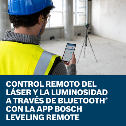 - Conectividad Bluetooth®: permite la configuración del láser desde el otro lado de la habitación y la activación del modo de ahorro de energía con ajuste de brillo, para ello es necesario emparejar el láser con un smartphone y la aplicación Bosch Leveling Remote