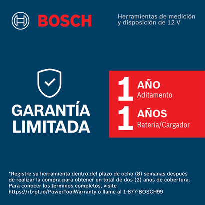 - Las herramientas de medición y diseño de Bosch están cubiertas por una garantía limitada de un año, con un año adicional si registra su herramienta dentro de las ocho semanas posteriores a la compra; para más información visite https://rb-pt.io/PowerToolWarranty o llame al 1-877-BOSCH99