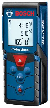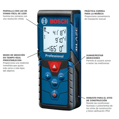 El medidor láser BLAZE™ Pro GLM165-40 de 165 ft de Bosch es una herramienta de funcionalidad completa y fácil de usar. Cuenta con una pantalla con retroiluminación fácil de leer, la cual ilumina las mediciones y muestra distancia, pies cuadrados, volumen y funciones indirectas de medición. Cuenta con una capacidad de almacenamiento de 10 mediciones. Este medidor cuenta con una función de suma y resta, la cual permite al usuario sumar y restar mediciones. El BLAZE™ Pro incluye un modo predeterminado de medición en tiempo real, el cual ajusta la medición dependiendo de la distancia a la que se encuentre el medidor láser del objetivo. Cuenta con tecnología de precisión láser y modo de medición en tiempo real, los cuales permiten realizar mediciones instantáneas y confiables de hasta 165 ft en cuestión de segundos. Tiene una precisión de hasta ±1/16" y cabe en el bolsillo, para tenerlo siempre a mano.