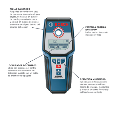 - Detección multimodo: para detectar montantes de madera, objetos metálicos (tuberías de acero/cobre, montantes y cañerías) o instalaciones eléctricas