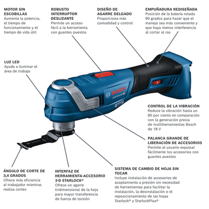 - Vibration control: reduce las vibraciones hasta en un 80% en comparación con la generación anterior de herramientas multiuso de 18 V de Bosch