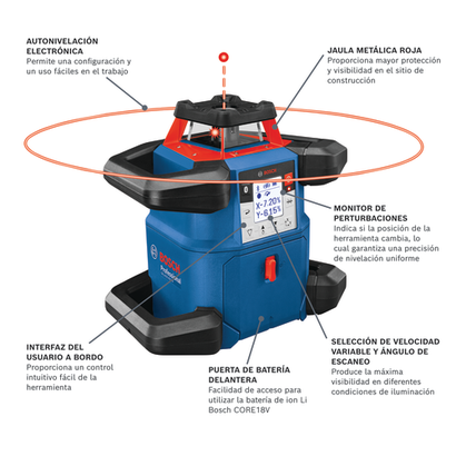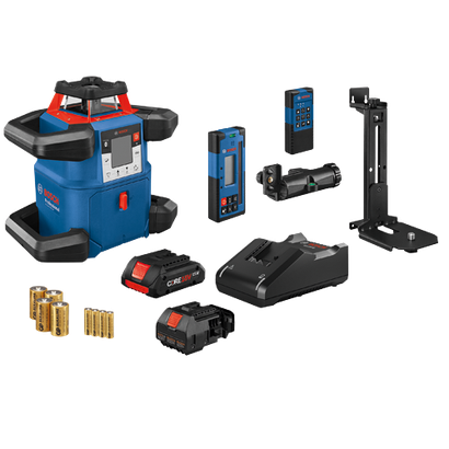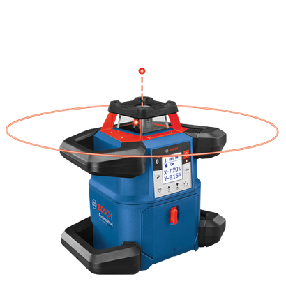 El láser giratorio conectado y autonivelador horizontal/vertical de 18 V REVOLVE4000 de Bosch con calibración realizada por el usuario uCAL constituye una solución integral para aplicaciones de nivelación en exteriores e interiores. Tiene una función Dual Dial-In Slope (doble cuadrante de inclinación) que permite el ajuste del ángulo de la pendiente en los ejes X e Y, para aplicaciones de nivelación. El GRL4000-80CHV funciona con una batería Bosch CORE18V® de 4 Ah, que ofrece un tiempo de ejecución prolongado. El láser giratorio es compatible con baterías de iones de litio CORE18V® de Bosch de 4 Ah y 8 Ah. También cuenta con un adaptador alcalino para usar cuatro celdas (D). El REVOLVE4000 está diseñado con una cubierta de protección y un diseño innovador de manija, y está construido según los estándares de protección contra el polvo y el agua IP68. Cuenta con conectividad Bluetooth® para vincularse a un dispositivo conectado a la aplicación Leveling Remote de Bosch. Esta aplicación controla el encendido/apagado, la función Dual Dial-In Slope (doble cuadrante de inclinación) y más. El láser giratorio cuenta con uCAL, para que el usuario realice la calibración con ayuda de una guía paso a paso del proceso. Esto evita el tiempo de inactividad de la herramienta y proporciona la confianza de que el láser es preciso. Aporta una precisión de hasta ±1/16" a 100 ft en aplicaciones horizontales y de ±1/8" a 100 ft en modo vertical, y un alcance de hasta 4.000 ft con un receptor láser. El láser cuenta con un haz vertical a un punto de 90º para aplicaciones de disposición, encuadre y plomada.