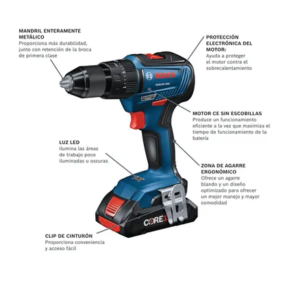 El taladro/atornillador de percusión GSB18V-490 de 1/2" y 18 V de Bosch está diseñado para hacer frente a los materiales y aplicaciones más exigentes (tales como metal o mampostería). Este potente taladro/atornillador de percusión cuenta con selección rápida de modo que permite cambiar a modo martillo, modo de taladrado y modo de atornillado con un embrague con 20 ajustes precisos de torque para reducir los daños en el sujetador. Su eficiente motor EC sin escobillas ofrece una autonomía excepcional y una vida útil más prolongada del motor. Genera 490 in-lb de torque y 0-22,000 BPM sin carga. Se trata de un taladro de velocidad variable con caja de dos velocidades, diseñado para el atornillado a torque elevado (0-460 RPM) o el taladrado a alta velocidad (0-1,800 RPM). Con un mandril actualizado completamente metálico, el taladro presenta soporte para brocas y una transferencia de torque extraordinarias. El GSB18V-490 cuenta con el sistema Electronic Motor Protection de Bosch, iluminación LED y un broche para el cinturón. Se trata de una herramienta de fácil manejo con una zona de agarre ergonómica.