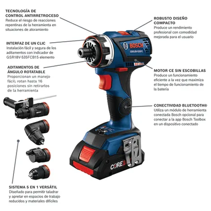 El taladro/atornillador de 18 V de Bosch está diseñado para profesionales que buscan un taladro/atornillador Connected-Ready de torque elevado que redefina sus límites para realizar los trabajos más difíciles. Es una herramienta Connected-Ready de torque elevado que redefine los límites. El atornillador tiene un soporte para broca hexagonal de 1/4" de liberación rápida y el sistema FlexiClick® 5 en 1 incluye tres acoplamientos profesionales: un mandril de ángulo recto, un soporte para brocas hexagonales y un acoplamiento de mandril metálico sin llave de 1/2". El taladro/atornillador GSR18V-535FCB15 de 18 V puede producir hasta 535 in-lb de torque. Los usuarios también pueden agregar el adaptador opcional para rotomartillo (no incluido), lo que convierte al taladro en un rotomartillo SDS plus® para perforación en mampostería. La herramienta tiene un soporte para broca hexagonal de 1/4" de liberación rápida y el sistema FlexiClick® 5 en 1 incluye tres acoplamientos profesionales: un mandril de 1/2" en ángulo recto, un acoplamiento de ángulo de desviación y un mandril metálico sin llave de 1/2". El kit incluye una batería Advanced Power CORE18V de 4 Ah con tecnología de celdas de iones de litio 21700 de última generación y un cargador de 18 V. El taladro incorpora funciones de conectividad (el módulo se vende por separado) que permiten conectar la herramienta a un dispositivo a través de la aplicación PRO360 de Bosch para personalizar los ajustes y recibir información detallada. El taladro tiene KickBack Control, un clutch de precisión y un eficiente motor sin escobillas.