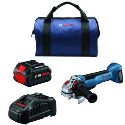 La amoladora en ángulo sin escobillas de 18 V y 4-1/2– 5" GWS18V-10P de Bosch es una amoladora ergonómica y robusta que está diseñada con una zona de agarre angosta para una mayor comodidad del usuario y una potencia considerable. Ofrece la combinación más innovadora de desempeño, control y potencia en una amoladora inalámbrica. El motor Brushless sin escobillas de la amoladora ofrece un desempeño comparable al de una amoladora con cable de 10 A y una mayor eficacia que maximiza el tiempo de ejecución y la productividad. La amoladora cuenta con un sistema de frenado que ayuda a realizar una parada rápida cuando se apaga el interruptor. También incluye otros componentes electrónicos avanzados, como KickBack Control, la protección contra el reinicio y la electrónica constante para una velocidad uniforme bajo carga. La amoladora cuenta con un interruptor de palanca antibloqueo con múltiples posiciones de agarre que ofrece una mayor variedad de opciones de agarre para mejorar la comodidad y el control, y un collarín de montaje de cabezal que es compatible con todos los protectores de amoladoras de Bosch. El kit incluye la batería CORE18V® de alto desempeño de 8 Ah, que está optimizada para las herramientas PROFACTOR™ y ofrece el doble de tiempo de ejecución que la GBA18V40.