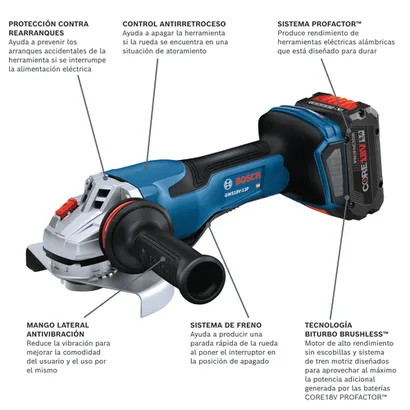 - Desempeño PROFACTOR™: ofrece una potencia comparable a la de una amoladora con cable de 13 A y un control de usuario avanzado