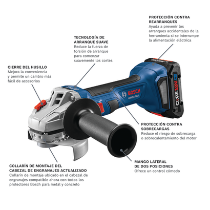 La GWS18V-8 de Bosch es una amoladora en ángulo ergonómica que combina portabilidad, rendimiento y la máxima comodidad para el usuario. Su motor Brushless sin escobillas ofrece una potencia equiparable a 8.0 A y una mayor eficacia que maximiza el tiempo de ejecución y la productividad. Esta amoladora de 4-1/2" y 18 V tiene protección de reinicio para ayudar a prevenir el arranque accidental al cambiar de batería, tecnología de arranque suave para reducir el torque de arranque y facilitar los cortes, además de una protección contra sobrecarga para reducir el riesgo de sobrecarga o sobrecalentamiento del motor. Está diseñada con engranajes biselados y en espiral que ofrecen una transmisión de potencia suave para aplicaciones de amolado. También cuenta con un protector ajustable sin herramientas y un collarín de montaje de cabezal actualizado que ahora es compatible con todos los protectores de concreto y de metal de Bosch. Esta herramienta dispone de una empuñadura lateral de dos posiciones, un diseño delgado de agarre suave y un bloqueo de husillo. El kit incluye una batería Advanced Power CORE18V® de 4 Ah de última generación que ofrece un tiempo de ejecución dos veces superior en comparación con la batería BAT612 de 2 Ah de la generación anterior.