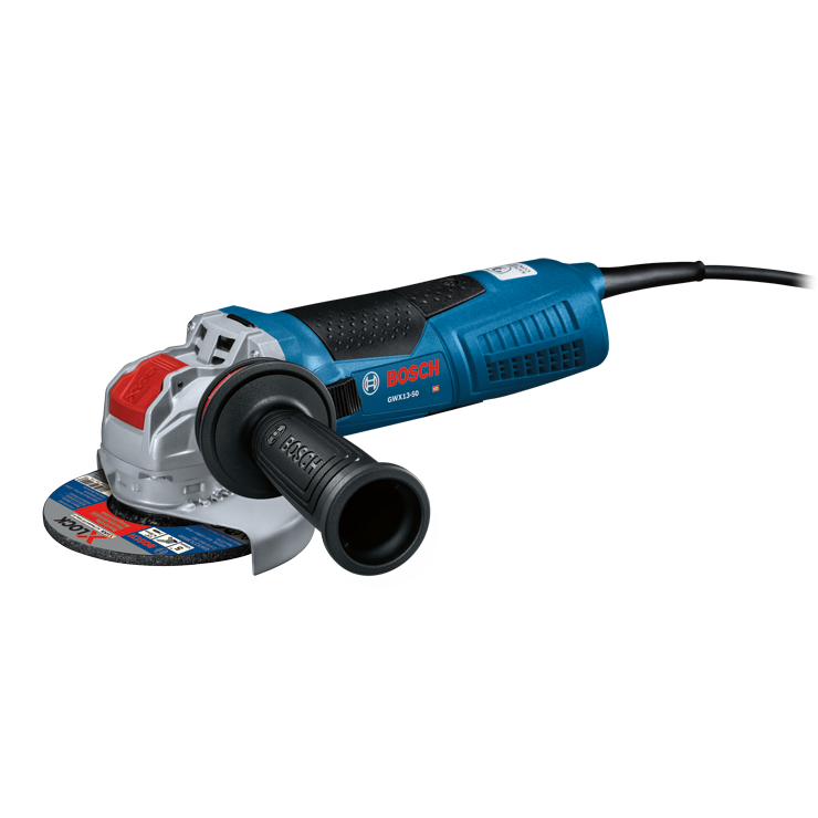 La amoladora en ángulo ergonómica X-LOCK GWX13-50 de 5" de Bosch incorpora el soporte X-LOCK que permite un cambio de disco hasta cinco veces más rápido que en las interfaces convencionales. El sistema cuenta con un enganche audible al montar un disco X-LOCK en una amoladora X-LOCK. El disco se monta correctamente sin necesidad de una llave de gancho o tuercas de brida. El disco se libera desde la amoladora tirando de una palanca. La amoladora en ángulo ofrece máxima potencia: 13 A y 11.500 RPM. Equipada con inductores con recubrimiento epóxico y sistema de refrigeración directa del motor, esta amoladora está diseñada para lograr una mayor vida útil. Incorpora engranajes biselados y en espiral para una transmisión más suave de la potencia. Para mayor comodidad, cuenta con un mango auxiliar que controla las vibraciones y un soporte ajustable sin herramientas.