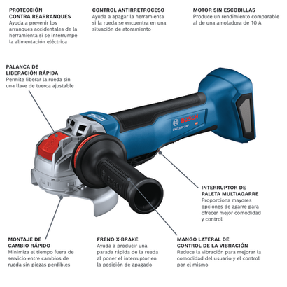 - Cambio de disco X-LOCK: presenta un montaje de enganche y una palanca de liberación del disco de amolado, lo cual permite un cambio hasta cinco veces más rápido