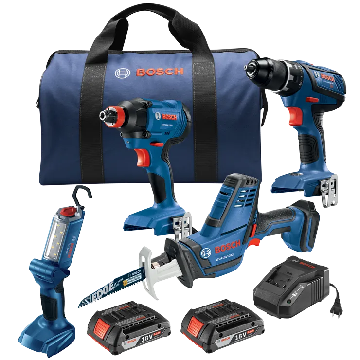 El kit combinado inalámbrico de cuatro herramientas de 18 V GXL18V-496B22 de Bosch es una forma sencilla de acceder a la plataforma de herramientas de 18 V de Bosch. Se incluye el atornillador/llave de impacto inalámbrico dos en uno GDX18V-1800 que se puede usar con brocas y llaves de dado. Realiza dos trabajos distintos con la misma herramienta y cambia de llave de impacto a atornillador de impacto rápidamente. El taladro/atornillador DDS181A incorpora un motor compacto que ofrece la misma potencia que los motores de 18 V convencionales, pero con un peso más ligero. Ofrece 600 in-lb máx. de torque. La sierra recíproca GSA18V-083 mide 15-3/4" y pesa tan solo 4.4 lb (solo herramienta), pero ofrece 0-3,050 carreras por minuto. La GLI18V-300 es una luz brillante con 300 minutos de autonomía por amperio/hora. El kit incluye dos baterías SlimPack de 2.0 Ah y 18 V y un cargador.