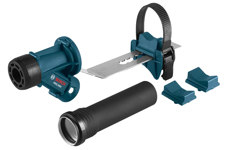 El acoplamiento de recolección de polvo SDS-max® y ranurados HDC300 de Bosch ayuda a extraer el polvo cuando se trabaja con la mayoría de martillos con entrada SDS-max® y ranurada de Bosch. Compatible con SDS-max® de Bosch, rotomartillos combinados con ranuras y martillos demoledores (no para el uso en modo de rotomartillo). El HDC300 permite al usuario acceder al cincel para instalarlo, retirarlo o ajustarlo sin tener que retirar el acoplamiento. La propia cubierta centra la succión de aire de la aspiradora alrededor del cincel para garantizar la máxima recolección de polvo. Además, gracias a su resistente cinta de sujeción, el acoplamiento se instala y ajusta con facilidad en todos los martillos Bosch compatibles. El acoplamiento también incluye un brazo de extensión metálico que se puede ajustar de modo que quede posicionado correctamente alrededor del cincel y poder adaptarse así a distintas longitudes de cincel.