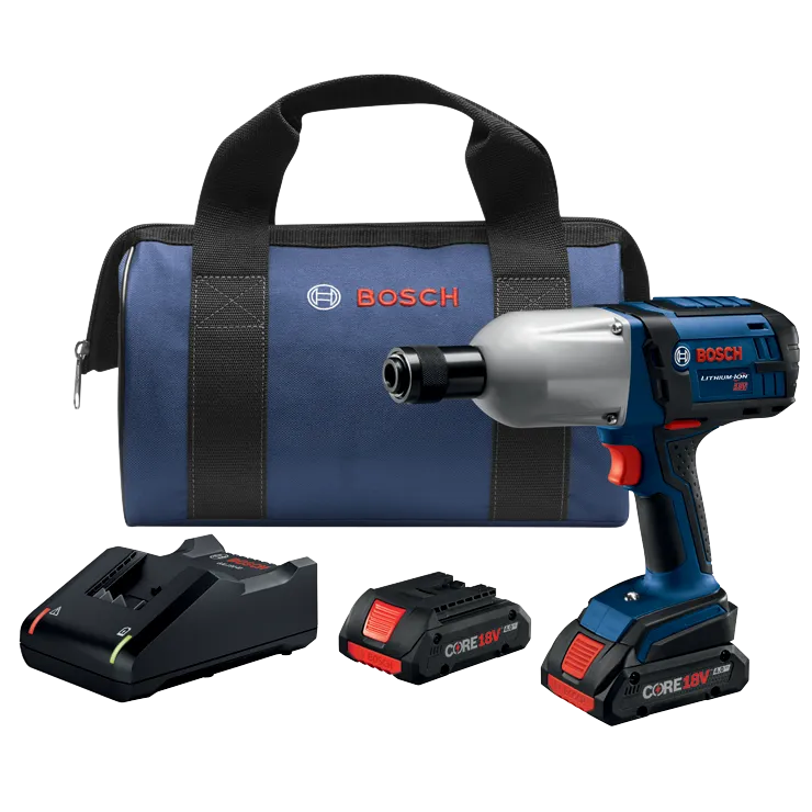 El kit de llave de impacto de torque elevado HTH182-B25 de 18 V de Bosch incluye una herramienta de uso industrial con mandril hexagonal de 7/16". Ha sido diseñada específicamente para profesionales de la construcción, carpinteros y, en general, para todos aquellos que dedican buena parte de su tiempo a tareas de fijación de tuercas y anclajes a torque elevado, como tirafondos o tuercas de rueda. Proporciona un torque profesional de hasta 500 ft-lb, de forma inalámbrica. La herramienta inalámbrica presenta un yunque hexagonal de cambio rápido de 7/16" para un cambio rápido de las brocas. El motor, completamente metálico, genera de 0 a 2,100 BPM y de 0 a 1,900 RPM. Esta llave de impacto incorpora un sistema de yunque y martillo con resorte que controla la reacción de torsión, para lograr más fácilmente la potencia de atornillado de impacto. El kit incluye dos baterías compactas de última generación CORE18V de 4,0 Ah. Cada una de ellas ofrece la misma potencia y tiempo de ejecución con un peso inferior, gracias a la tecnología de celdas 21700. La batería CORE18V iguala la potencia de la batería original de 4,0 Ah y doble capa con la mitad de celdas. Incorpora el sistema CoolPack 2.0 de gestión térmica.