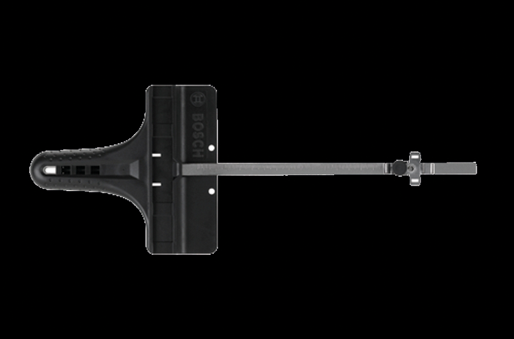 Esta versátil guía permite cortes en paralelo de 5/8'' a 6'' (16 mm a 170 mm) desde el borde de la pieza. También permite cortar círculos de entre 5'' y 16-1/2'' (127 mm a 420 mm) de diámetro. Para usar con todas las sierras caladoras de Bosch, salvo la JS260.