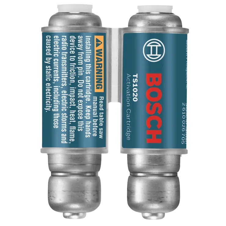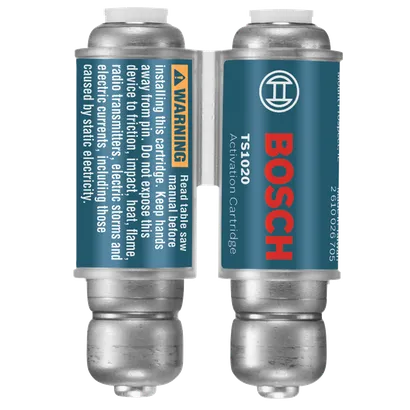 El cartucho de activación doble TS1020 está diseñado para uso exclusivo con la sierra de mesa de 10" para entorno de trabajo GTS1041A REAXX de Bosch. El cartucho de activación doble forma parte del sistema Active Response Technology de la sierra, que transmite una señal eléctrica de baja tensión sobre la hoja. La señal se altera si se produce un contacto con la piel del usuario y provoca una reacción química en un cilindro de activación, una reacción similar al despliegue de un airbag en un vehículo. Sin embargo, en este caso, en vez de que se despliegue un airbag, la reacción química dispara un pistón que presiona contra el brazo de caída. Esta acción fuerza rápidamente el disco de la sierra hacia abajo alejándolo del usuario y evitando así que este sufra una lesión grave. Cada cartucho es válido para dos activaciones y deberá sustituirse tras la segunda activación. La herramienta también dispone de espacio para guardar cartuchos de reserva. Una vez activado, el sistema se puede reiniciar en menos de 60 segundos. Cada cartucho de activación doble lleva impresa la fecha de caducidad y tiene un plazo de conservación de 20 años. El cartucho de activación doble es compatible con discos estándar de 10" de acabado fino y para construcción, así como con hojas apiladas para ranurado perpendicular.